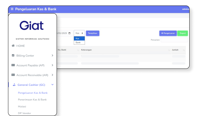 Mengelola penerimaan dan pengeluaran kas harian secara terpusat untuk memastikan arus kas tetap terkontrol. Fitur ini membantu pencatatan uang masuk dan keluar berjalan rapi dan mudah ditelusuri.